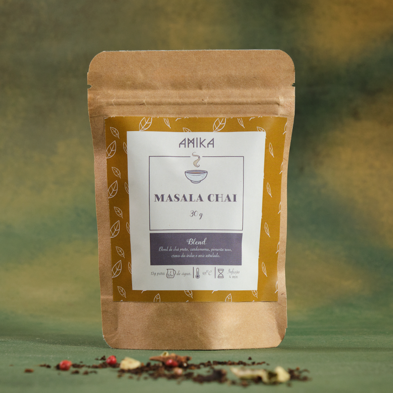 Tipo: Blend de Chá Preto Origem: Brasil Composição: Blend de chá preto, cardamomo, pimenta rosa, cravo-da-india e anis estrelado.